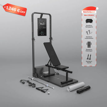 Mit dem umfangreichen Zubehör – darunter Langhantel, intelligente Griffe, Trizepsseil, Fußschlaufen, Skigriffe und Ruderbank – kannst du eine Vielzahl an Übungen absolvieren, die sonst nur im Fitnessstudio möglich wären.