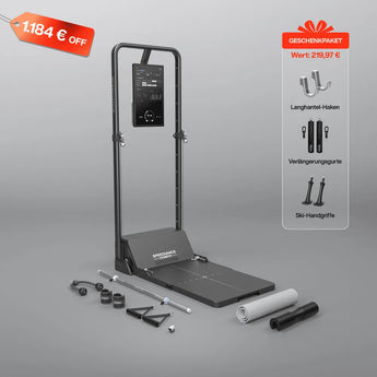 Mit dem umfangreichen Zubehör – darunter Langhantel, intelligente Griffe, Trizepsseil, Fußschlaufen, Skigriffe und Ruderbank – kannst du eine Vielzahl an Übungen absolvieren, die sonst nur im Fitnessstudio möglich wären.