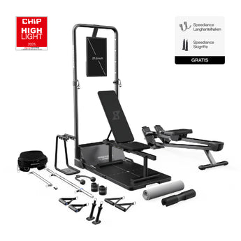 Mit dem umfangreichen Zubehör – darunter Langhantel, intelligente Griffe, Trizepsseil, Fußschlaufen, Skigriffe und Ruderbank – können Sie eine Vielzahl an Übungen absolvieren, die sonst nur im Fitnessstudio möglich wären.