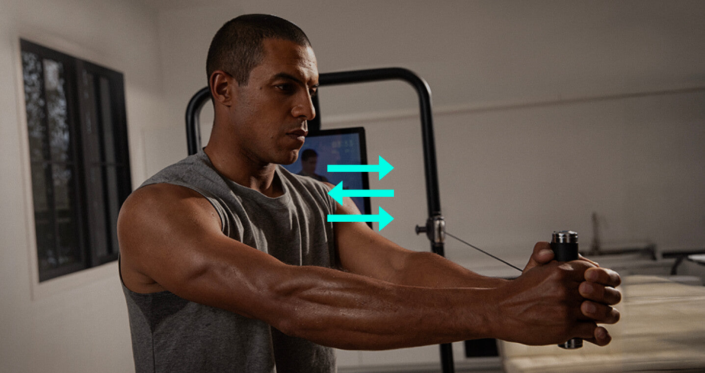 Der exzentrische Modus isoliert die negative Bewegungsphase eines Workouts und erhöht den Widerstand, wenn du in die Ausgangsposition zurückkehrst.
