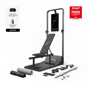 Mit dem umfangreichen Zubehör – darunter Langhantel, intelligente Griffe, Trizepsseil, Fußschlaufen, Skigriffe und Ruderbank – können Sie eine Vielzahl an Übungen absolvieren, die sonst nur im Fitnessstudio möglich wären.