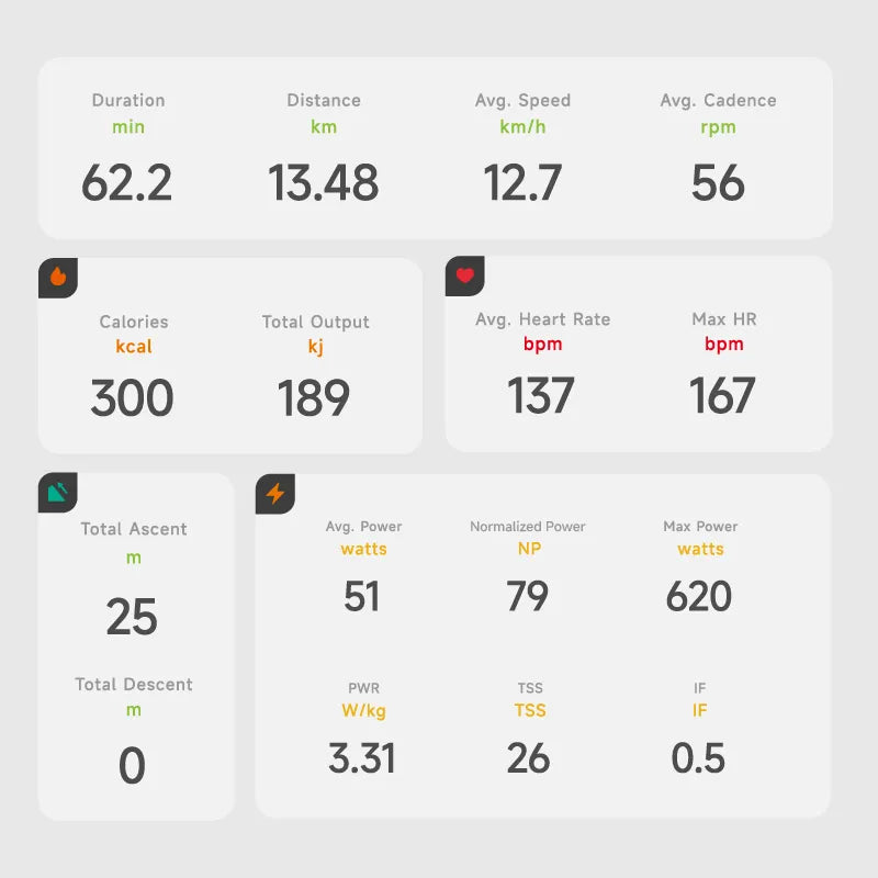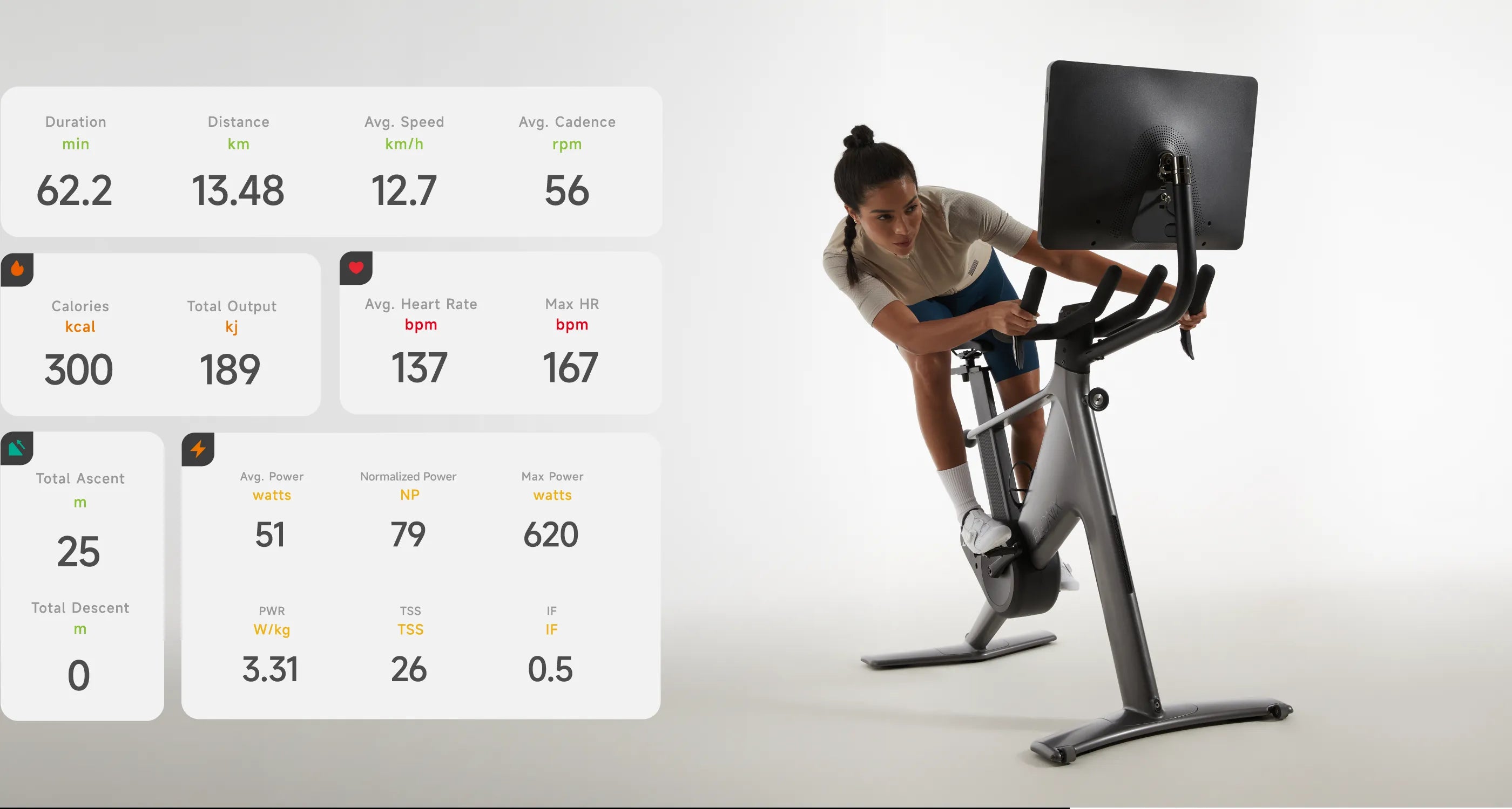Das Fahrrad kann mit Zwift, Strava, Android- und Apple-Uhren und mehr verbunden werden. In jeder Bildschirmansicht kannst du unten eine Vielzahl von Leistungsdaten sehen, um dein Training zu optimieren.