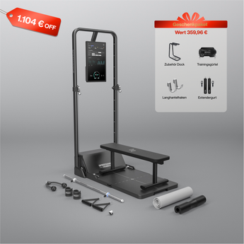 Mit dem umfangreichen Zubehör – darunter Langhantel, intelligente Griffe, Trizepsseil, Fußschlaufen, Skigriffe und Ruderbank – kannst du eine Vielzahl an Übungen absolvieren, die sonst nur im Fitnessstudio möglich wären.